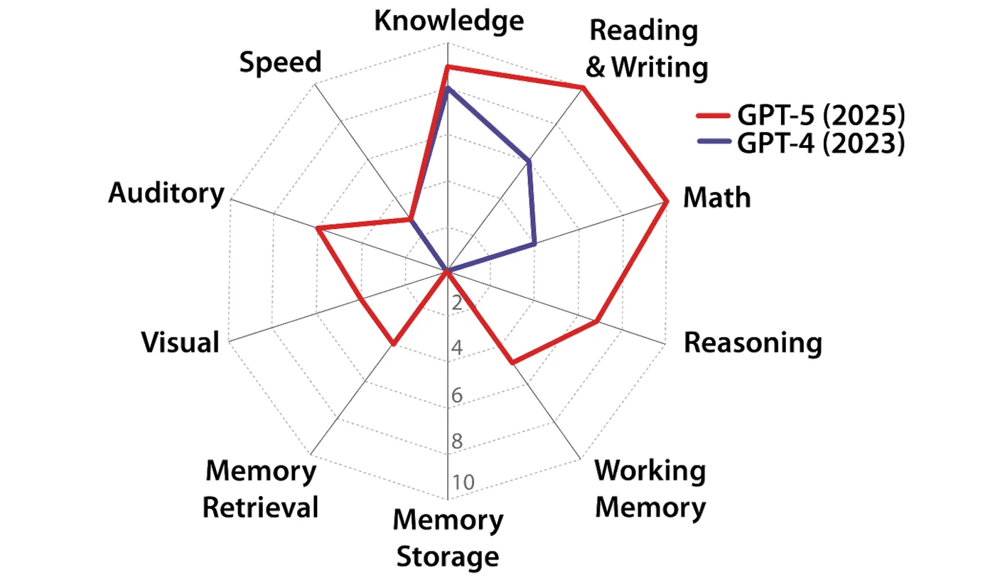 Researchers collaborated on a test grounded in the Cattell‑Horn‑Carroll theory of human cognition and mapped ten domains of general intelligence: reasoning, memory, perception, knowledge, language, math, and more. Each domain is scored not in vague metaphors, but in human terms.